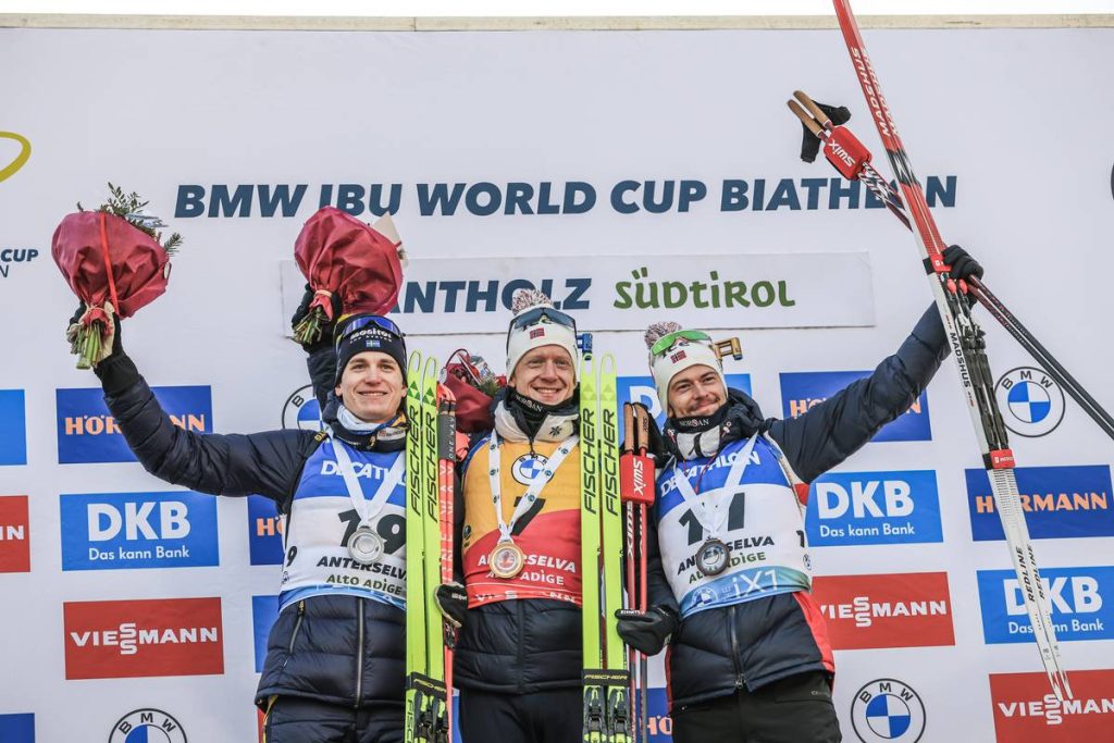 Tous les trois à neuf sur dix derrière la carabine, Roman Rees pour l’Allemagne, Vetle Sjaastad Christiansen pour la Norvège et Émilien Jacquelin pour la France, complètent la cérémonie des fleurs.