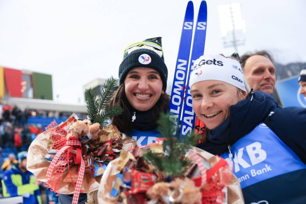 La cérémonie des fleurs récompense également deux autres Françaises : Julia Simon et Jeanne Richard. La première, malgré une erreur sur son tir debout, reprend des couleurs sur les skis, avec le neuvième temps du jour. Une performance qui lui permet de terminer à la cinquième place, juste derrière l’Italienne Dorothea Wierer (une erreur sur le debout et troisième temps), mais devant sa jeune compatriote Jeanne Richard. Après sa troisième place sur la mass start de Ruhpolding le week-end dernier, la Française fait encore forte impression. Elle s’offre un nouveau plein et prouve sa belle régularité derrière la carabine. Un résultat qui est synonyme de quatrième place au classement de la coupe du monde, qu’elle ravit à la Finlandaise Suvi Minkkinen et qui connaît une grosse contre-performance (seulement soixante-neuvième), 100 points derrière la Suédoise Elvira Oeberg, absente à Antholz pour cause de maladie. Mieux : Jeanne Richard conforte son maillot bleu de meilleure jeune.