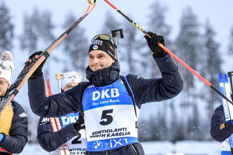 En forme sur les skis, le Français réduit de moitié son retard sur Sturla Holm Laegreid. À 15/15 en arrivant sur son dernier tir, Émilien Jacquelin jouait le 20/20 qui lui aurait permis de se battre pour la victoire. Malheureusement, il partira deux fois à la faute. Frustré mais sans s’avouer vaincu, il sortira de l’anneau de pénalité en troisième position avec de la marge sur ses poursuivants. Sebastian Samuelsson, Roman Rees et Jesper Nelin manquent tout trois une balle, et terminent la course dans le même ordre pour compléter la cérémonie des fleurs.