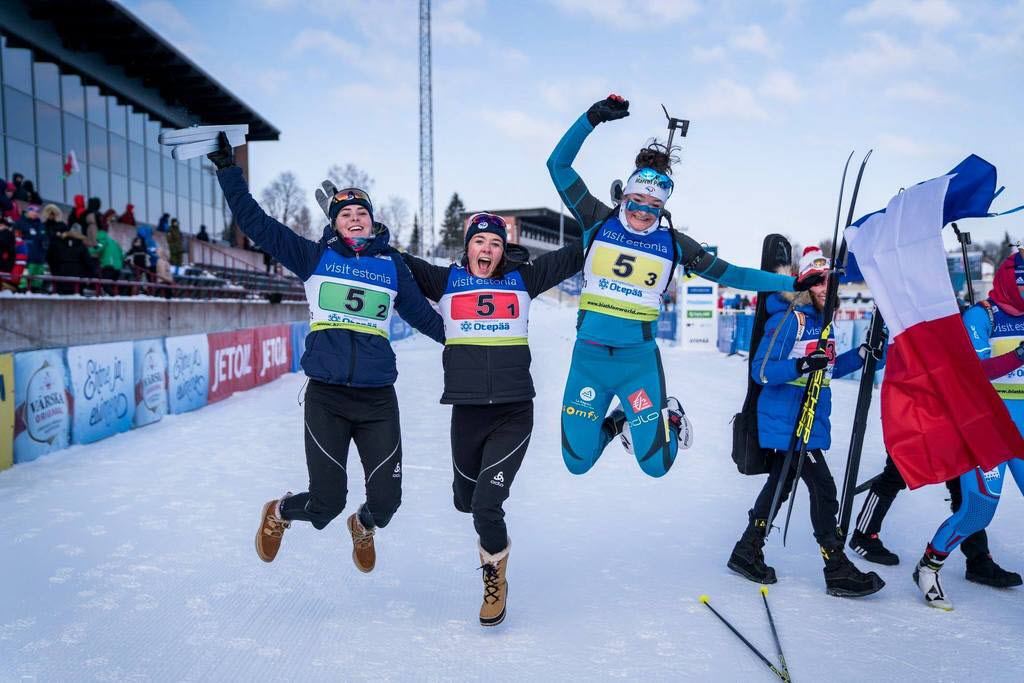 Myrtille Bègue (FRA), Camille Bened (FRA) et Lou Jeanmonnot (FRA) en or sur le relais des Mondiaux juniors 2018 © IBU
