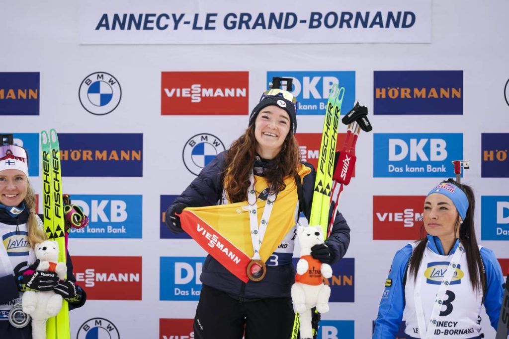 Battue pour 3,3 secondes sur le sprint par Hanna Oeberg, Lou Jeanmonnot prend sa revanche sur la poursuite. La Doubiste brise sa malédiction du Grand-Bornand et prend, dans le même temps, les commandes du général. Suvi Minkkinen et Dorothea Wierer complètent le podium. Julia Simon termine quatrième.
