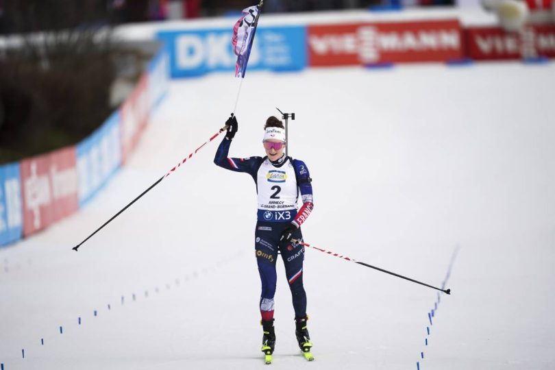 Dès le départ, la native de Pontarlier semblait sereine et à son aise sur la piste. Arrivée sur le pas de tir face à la Suédoise, elle prenait l’ascendant avec le plein au couché. La Scandinave partait pour un anneau de pénalité. Personne ne la reverra, tant sa gestion de course était parfaite. Tour après tour, balle après balle, la biathlète de 27 ans récitait son biathlon avec trois tirs parfaits et sans accroc. En volant littéralement sur cette piste, elle arrivait au dernier debout avec plus de 45 secondes d’avance sur le reste du plateau. L’avance était large et elle se permettait même de louper une balle. La seule de sa course. Un dernier tour triomphal où elle a pu profiter de ces instants magiques avec les supporters français présents.