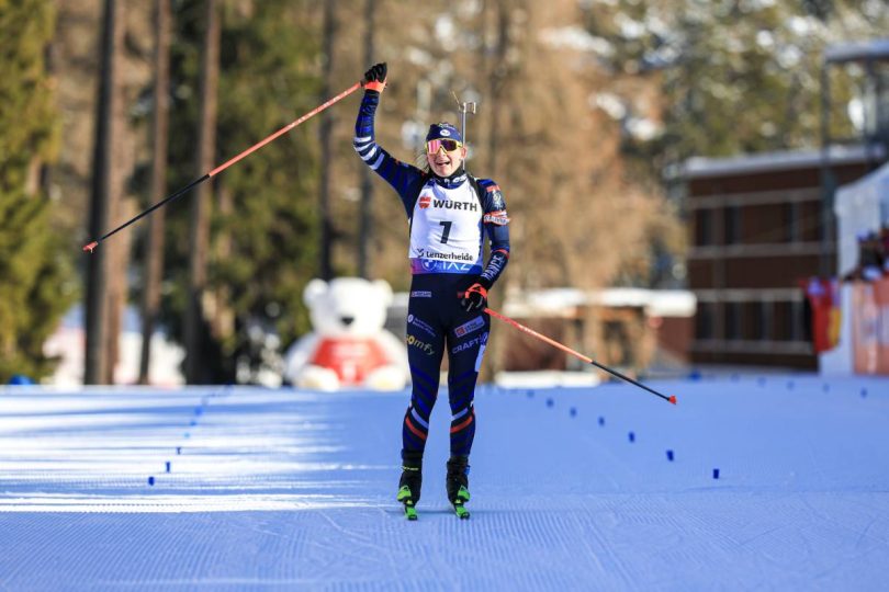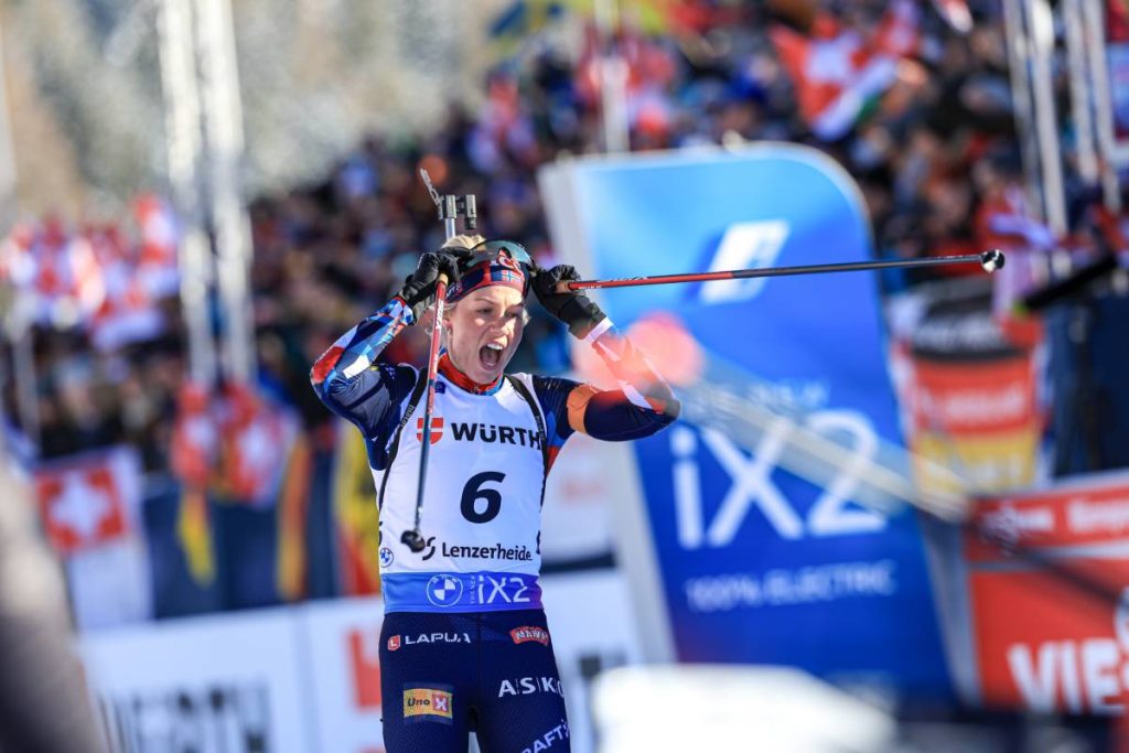 Ingrid Tandrevold et Lisa Vittozzi, respectivement deuxième et troisième du sprint, distancées après le deuxième tir, seule Julia Simon semblait pouvoir menacer Justine Braisaz-Bouchet à mi-parcours. À moins de 10 secondes de sa compatriote, la tenante du gros globe avait encore toutes ses chances. Une faute pour elle au premier debout, Justine Braisaz-Bouchet reprenait de la marge en se présentant sur le dernier tir avec 35 secondes d’avance. Le suspense toujours au rendez-vous puisque c’était au tour de la jeune maman de partir cette fois-ci à la faute (un tour de pénalité) tandis que Julia Simon signait le sans-faute. Ressortie comme une balle du pas de tir, la championne du monde de la poursuite attaquait le dernier tour avec seulement 7.5 secondes de retard ! Mais plus forte physiquement dans ces derniers kilomètres, Justine Braisaz-Bouchet résistait au retour de Julia Simon pour s’imposer sur la poursuite et réaliser, comme Lou Jeanmonnot à Ostersund, un magnifique doublé sprint-poursuite à Lenzerheide.