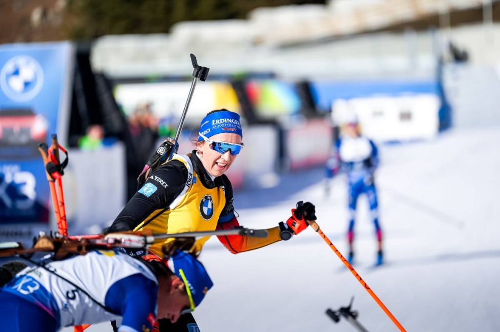 Franziska Preuss, quant à elle a dû cravacher pour arracher la troisième place. Pourtant avec 97 % de réussite sur le tir couché, la biathlète d’outre-Rhin partait pour 150 mètres supplémentaires sur ses cinq premières cibles. La leader du général se reprenait par la suite en signant le 15/15. Ressortie avec Jeanne Richard, le duel dans la dernière boucle tourne à l’avantage de la plus expérimentée, plus véloce sur les spatules. 10ème podium cette saison pour Franziska Preuss, qui conserve 92 points d’avance au général sur Lou Jeanmonnot.