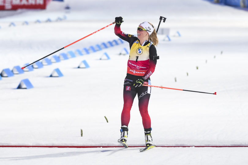 Passée tout près l’an dernier, elle n’a pas laissé de place au doute cet hiver pour conquérir le trône de numéro une mondiale. Reine des Mondiaux de Pokljuka, elle totalise douze succès individuelles. Avec encore trois courses au programme, elle pourrait même égaler, voire dépasser, le mythique record de Magdalena Forsberg et ses quatorze victoires sur l’exercice 2000-2001.