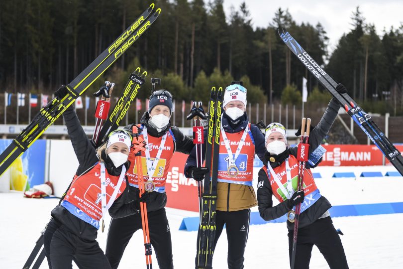 Tiril Eckhoff, fraichement auréolée de son premier gros globe depuis la veille, a commencé à creuser l’écart dès le premier relais. Un 10/10 et une avance de trente secondes au moment de lancer Marte Olsbu Roeiseland en deuxième relayeuse… La concurrence ne reverra plus les Norvégiens. La septuple médaillée des Mondiaux d’Antholz 2020 fera fructifier le relais de sa compatriote, tout comme Tarjei et Johannes Boe qui termineront le travail sereinement. Au final, Un 73ème podium record pour les “Norges” cet hiver. Tout simplement exceptionnel ! (le record précédent était de 72 pour les Allemands en 2006/2007).