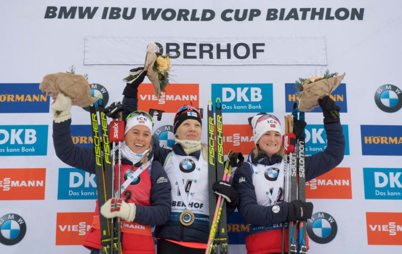 Derrière la finlandaise, les favorites sont venues s’empiler pour les places d’honneur. Les norvégiennes Tiril Eckhoff, en tête à mi-course (+30.2 sec. à 16/20) et Marte Olsbu Roeiseland (+35 sec. à 17/20) ont complété le podium et peuvent se targuer d’être les seules à être restées sous la minute.