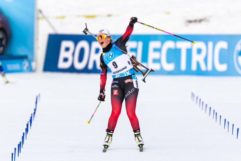 Dans la tempête, Ingrid Tandrevold s’est imposée pour la toute première fois de sa carrière hier. Pour couronner le tout, elle repart avec le petit globe de la mass-start.