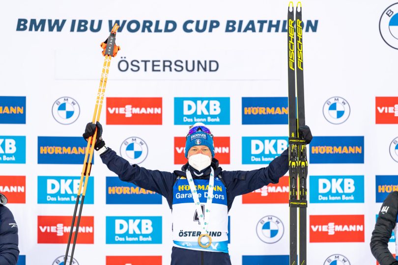Parti avec le dossard numéro 4, Lukas Hofer réalise la course parfaite. Il franchit la ligne d’arrivée en tête et ne la quittera plus. Sebastian Samuelsson s’invite sur la deuxième marche du podium et se positionne idéalement pour la poursuite, à seulement 4 secondes de l’Italien.