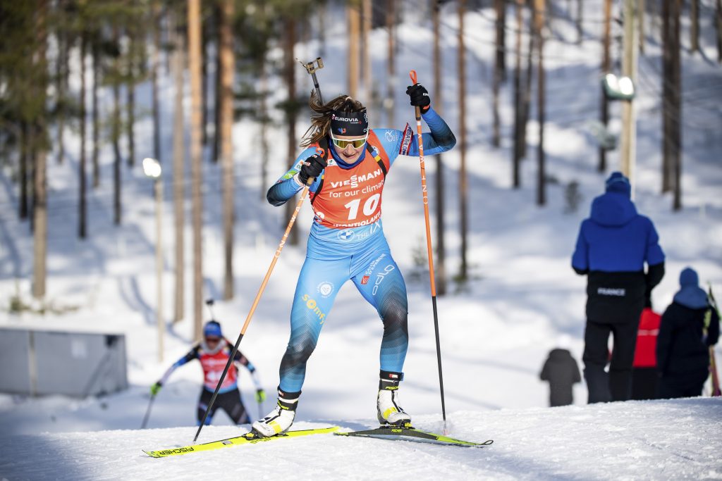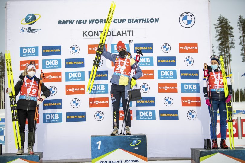 Les conditions climatiques et la piste exigeante de Kontiolahti jouaient aujourd’hui en faveur des bonnes skieuses. Là où le moindre tour de pénalité coûtait cher physiquement, les meilleures skieuses se sont distinguées en prenant les premières places. L’ancienne fondeuse Denise Herrmann s’empare de la victoire avec un beau 9/10 grâce au 3e temps de ski du jour. Tiril Eckhoff, derrière elle, renoue avec le podium et monte sur la boîte pour la première fois de l’hiver.