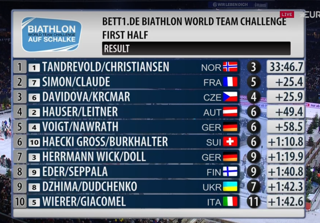 Ingrid Landmark Tandrevold et Vetle Sjaastad Christiansen ont pris une option pour la victoire finale. En effet, le binôme norvégien a dominé assez nettement la mass start du Biathlon Auf Schalke. Les Scandinaves ont mené de bout en bout la première partie du show allemand, notamment grâce à leur solidité derrière leur carabine (trois fautes). Sur la ligne d’arrivée, ils devancent de 25.4 secondes la paire française composée de Julia Simon et Fabien Claude, auteurs de cinq erreurs au tir. Les Tchèques Marketa Davidova et Michal Krcmar complètent le podium provisoire à 25.9 secondes.