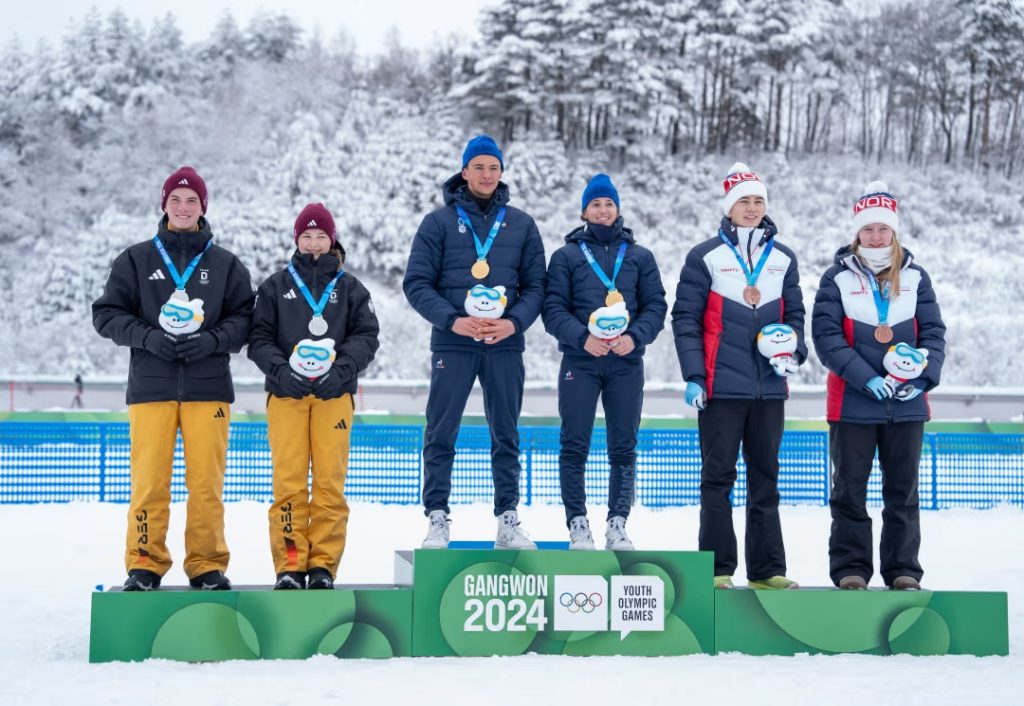 Avec seulement cinq pioches, les Français ont dominé l’épreuve de bout en bout, lançant à chaque fois leur partenaire en première position provisoire. Après un dernier relais parfait d’Alice Dusserre (sans-faute), Antonin Guy comptait plus d’une minute d’avance sur l’Allemagne, deuxième, pour terminer le travail comme il se doit. Ce qu’il fera avec brio (une pioche au tir debout). Au-dessus du lot, les Bleus l’emportent largement, 50 secondes devant l’Allemagne de Marie Keudel et de Korbi Kuebler. Les biathlètes d’outre-Rhin ont dû se battre jusque dans les derniers mètres pour décrocher l’argent. Trois dixièmes derrière, la Norvège d’Eiril Nordboe et de Storm Veitsle complète le podium.