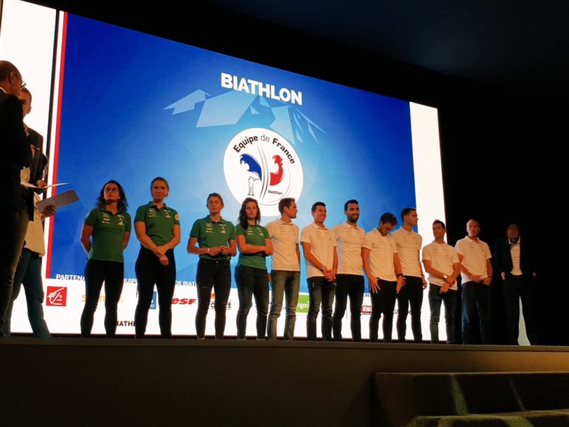 Anaïs Bescond, Julia Simon, Célia Aymonier, Justine Braisaz, Simon Desthieux, Quentin Fillon-Maillet, Martin Fourcade, Émilien Jacquelin et Antonin Guigonnat, accompagnés de leurs coachs Fred Jean et Vincent Vittozz, étaient tous là ce matin au Pavillon Grabriel pour la présentation des équipes de France A de biathlon.