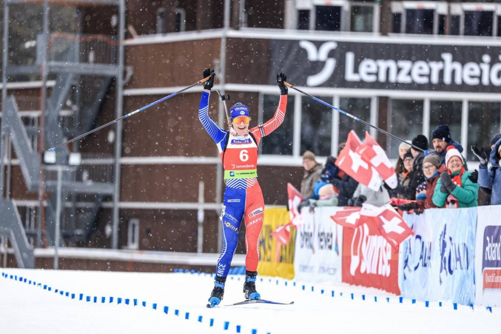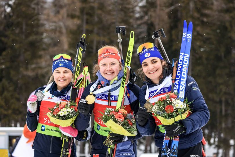 Elle est là, cette première breloque française dans ces championnats d’Europe de Lenzerheide ! En effet, Gilonne Guigonnat, sixième du sprint hier, effectue une course très solide, notamment derrière la carabine avec un 19/20. Malgré le treizième temps de ski de cette poursuite, la Haut-Savoyarde a réussi à lâcher Vanessa Hinz pour venir s’assurer une jolie médaille de bronze dans cette dernière boucle. La petite sœur d’Antonin arrivait même sur le dernier tir, pour jouer l’or face à Selina Grotian entre autres. Elle loupera notamment sa quatrième balle tandis que l’Allemande réussira le plein. Malgré tout, Gilonne Guigonnat est certainement très satisfaite de ce podium, quelques mois après son premier succès sur l’IBU Cup, sur la mass-start 60 de Val-Ridanna. Elle succède à Chloé Chevalier, dernière médaillée française sur ces championnats d’Europe en individuelle (troisième du super-sprint en 2020).