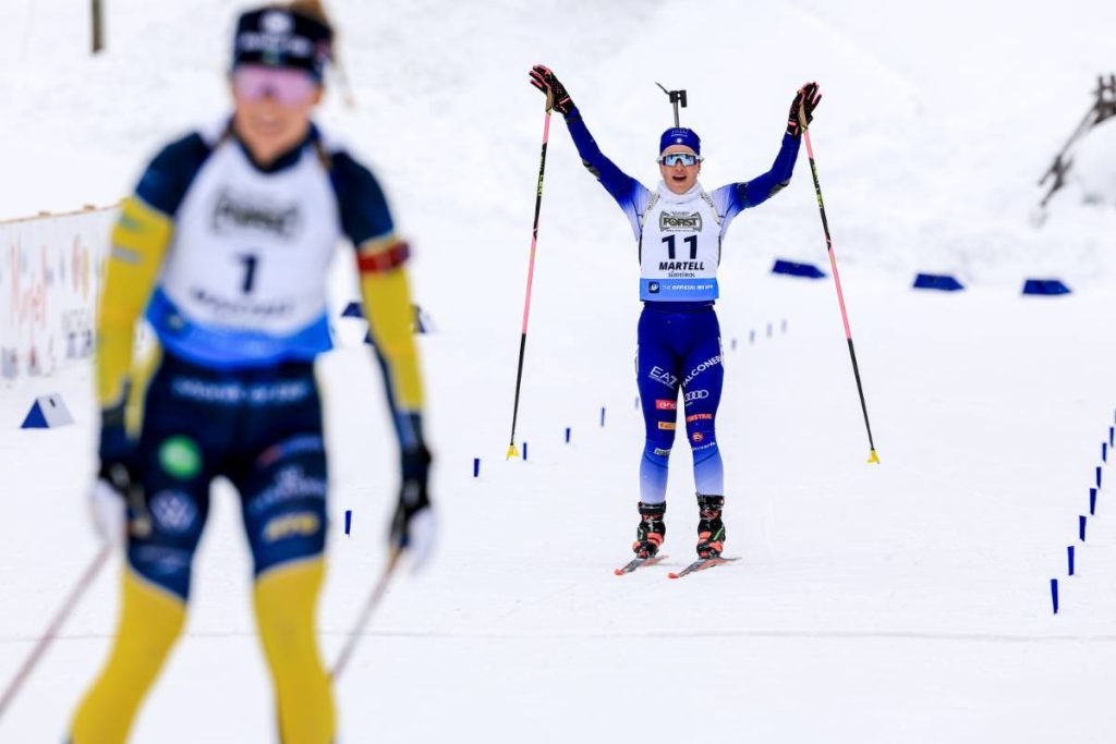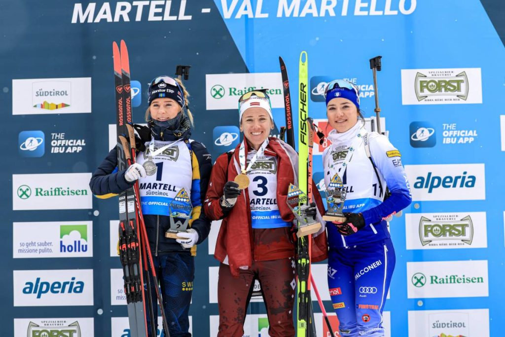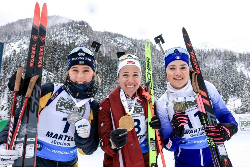 Médaillée de bronze sur le sprint hier, Baiba Bendika, 33 ans, s’offre une seconde jeunesse cette semaine à Martell. S’élançant avec 49 secondes de retard sur Anna Karin Heijdenberg, la Lettone a été (presque) parfaite de bout en bout. Impressionnante sur les skis, elle comble son retard dès le premier tir suite à une première erreur de la Suédoise. Arrivées ensemble sur le deuxième couché, la Scandinave repartait à nouveau sur l’anneau tandis que la native de Cēsis blanchissait ses cinq cibles. Avec 15 secondes de marge, son avance atteindra 1 minute avec un nouveau sans-faute sur le premier debout. Seule face à son destin, la pression commençait à monter lors du dernier tir. Elle ouvrait grandement la porte avec trois fautes, mais personne finalement ne réussit à s’y engouffrer.