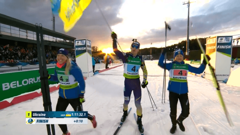 Composé de Valij Semerenko, Yuliia Dzhima, Artem Pryma et Dmytro Pidruchnyi, le relais ukrainien a parfaitement tenu son rang et a fait parler son expérience aujourd’hui à Minsk pour décrocher le titre européen. Toujours aux avant-postes, ils feront la différence sur le tout dernier tir face aux locaux de ces championnats. Sergey Bocharnikov, sans doute pris par l’enjeu, ira visiter l’anneau de pénalité à une reprise, tandis que le champion du monde la poursuite en 2019 Dmytro Pidruchnyi distillait ses balles tout à l’expérience, pour ressortir du pas de tir avec le plein et surtout la victoire au bout.
