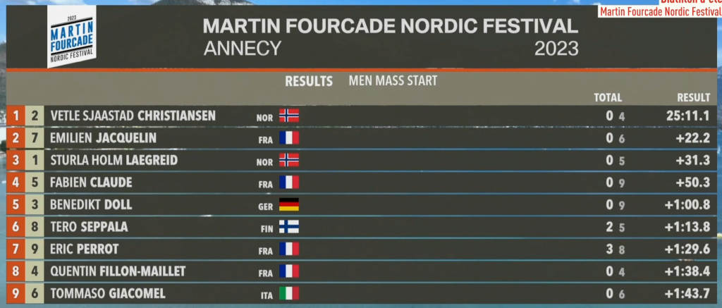 Au terme d’une course menée de bout en bout, Vetle Sjaastad Christiansen remporte le Martin Fourcade Nordic Festival. Émilien Jacquelin prend la 2e place devant Sturla Holm Laegreid.