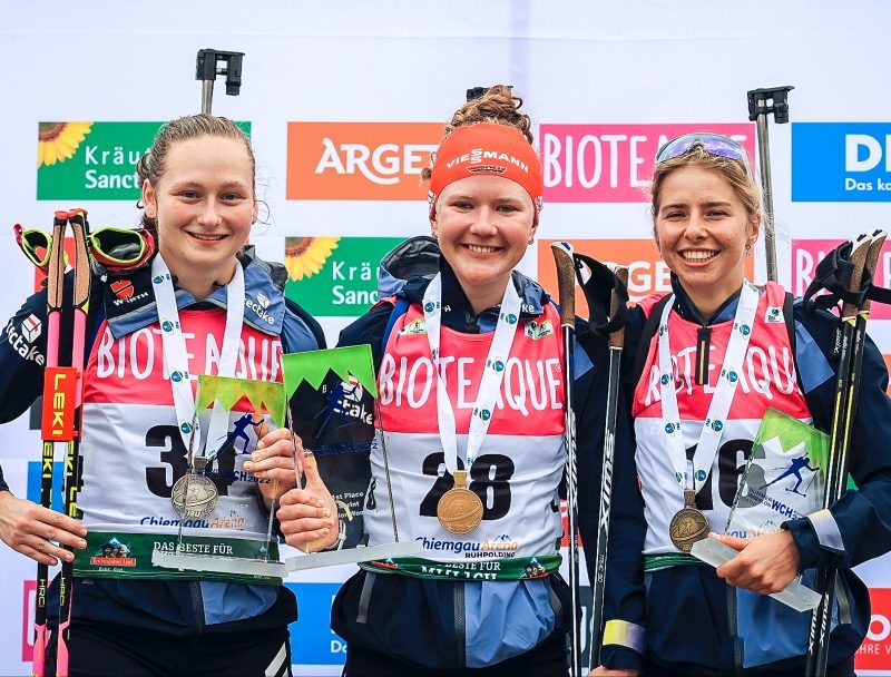 Elles aussi seront en position idéale demain. Si la République Tchèque a fait coup double chez les hommes, les Allemandes ont signé un fantastique triplé sur la course féminine. Championne d’Europe junior de la spécialité, Selina Grotian, 18 ans seulement, se pare du plus beau des métaux devant deux coéquipières. Sans-faute sur le pas de tir, la plus rapide en piste, elle devance Selina Marie Kastl (10/10) de 6.5 secondes, vainqueure 48 heures plus tôt sur le super sprint. À 45.6 secondes, on retrouve Johanna Puff (9/10) pour le bronze.