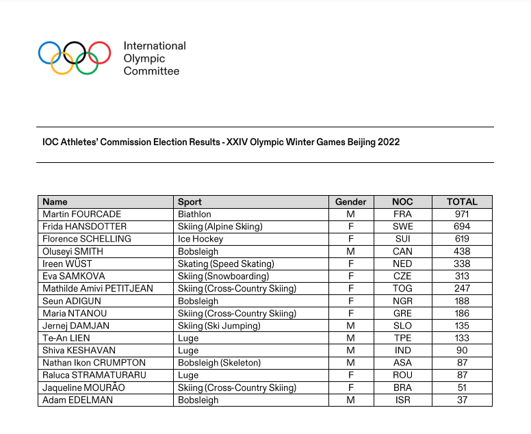 Dans une élections où 16 candidats étaient en lice, Martin Fourcade a obtenu le plus de suffrages (voir détail du vote ci-dessous). Il a recueilli 971 voix, sur un total de 2307 votants. la Suédoise Frida Hansdotter, ancienne grande skieuse alpine, est la deuxième athlète élue avec 694 voix. Ils intègrent tous les deux cette commission, pour une durée de 8 ans, qui a pour but de “de représenter les athlètes et de les soutenir, sur l’aire de compétition comme hors de celle-ci.”