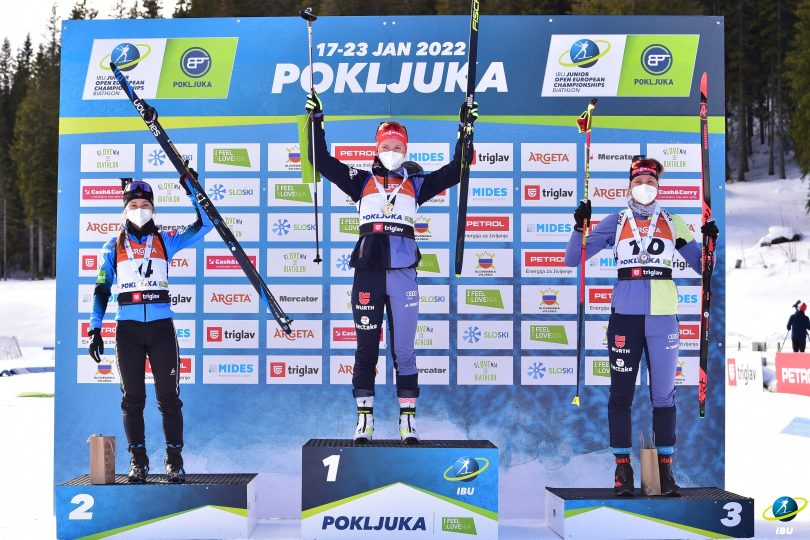 Jeanne Richard va repartir de Pokljuka avec des médailles plein les poches. Après l’argent sur l’individuel, puis l’or sur le relais mixte, la biathlète des Gets a pris une belle deuxième place ce matin sur la poursuite. Au pied du podium la veille, la tricolore de 19 ans a réalisé une prestation solide. En tête après le deux premiers tirs couché grâce à un sans-faute, la tricolore de 19 ans commettra une faute sur chaque passage au tir debout. L’occasion pour l’Allemande Selina Grotian de filer vers un nouveau titre, déjà vainqueure la veille, et à sa compatriote Lisa Maria Spark de prendre quelques secondes d’avance sur Jeanne Richard avant d’aborder la dernière boucle.